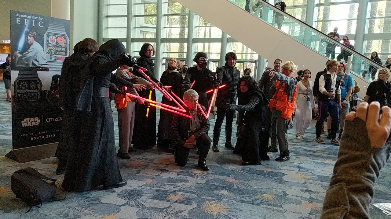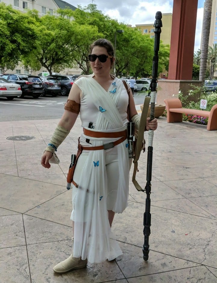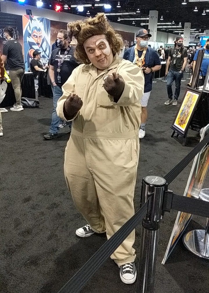 Fred and I attended Star Wars Celebration in Anaheim this year. We stayed in a hotel so we wouldn’t have to commute each day to the convention center like I did years ago. I had a four-day pass, while Fred had a day pass for Saturday. Unfortunately I was unable to attend any of the panels, because I had medical appointments on Thursday and Friday. My regular convention buddy couldn’t attend this year, so I had to go it alone. One big problem: Our hotel was three long blocks away from the convention center. Luckily I had my walker with a built-in seat. I wouldn’t have made it up to and back from the venue without it, especially with my many bouts of fatigue that day.
