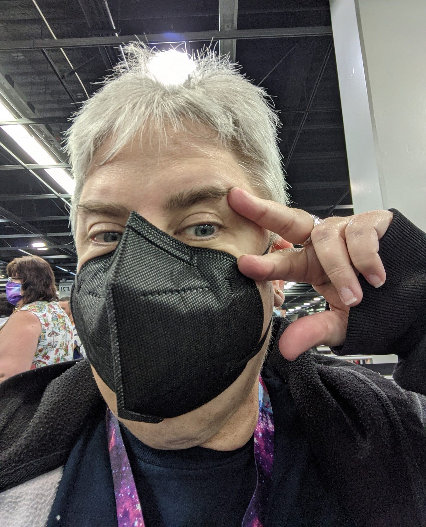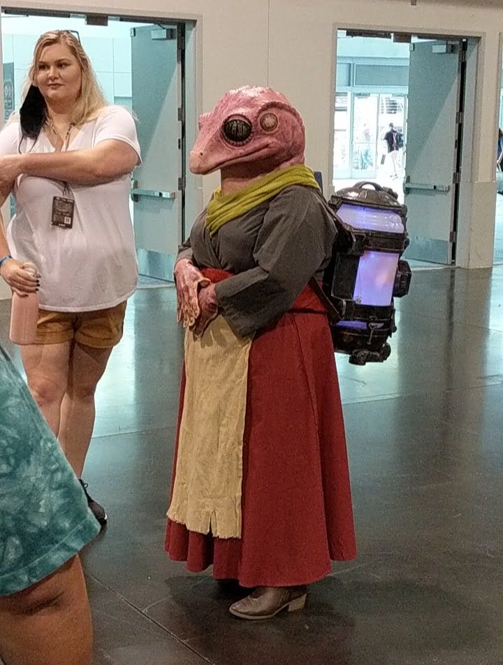 On Saturday, Fred and I both went to the convention center. If traveling three blocks with my rolling walker was tough, that was nothing compared to pushing a large man in a wheelchair. We had to stop for frequent breaks while other guests in their elaborate costumes walked on by like they were wearing swimsuits at the beach.